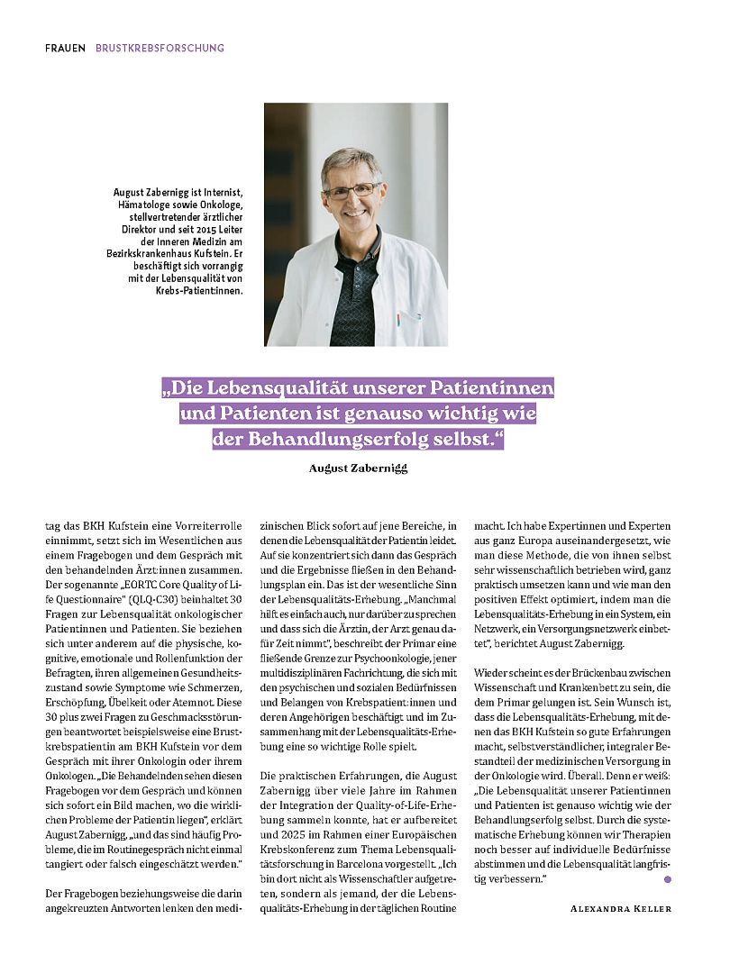 "Die Lebensqualität unserer Patientinnen und Patienten ist genauso wichtig wie der Behandlungserfolg selbst.“ so Prim. Priv.-Doz. Dr. August Zabernigg.