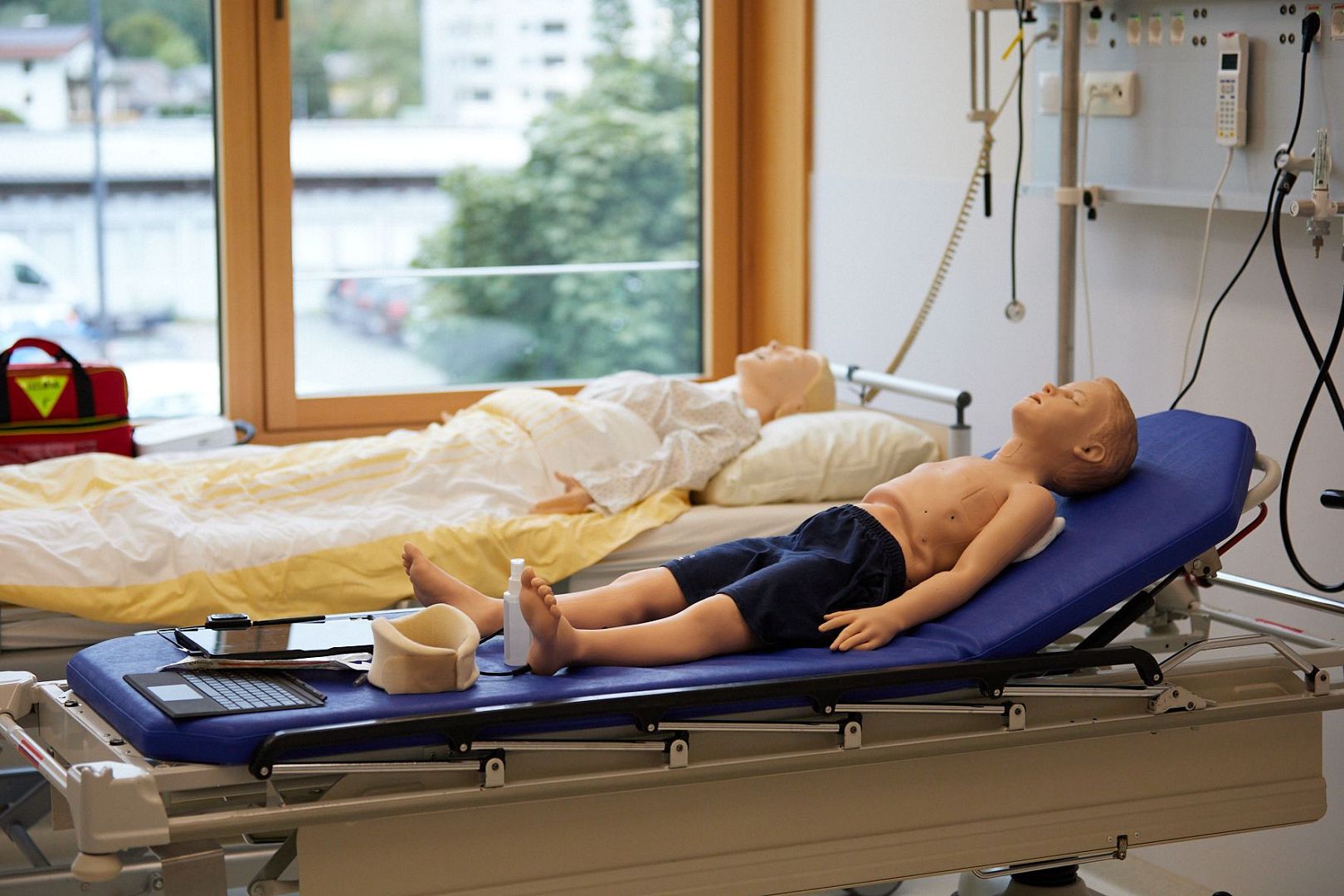 Schwerpunkt unserer Ausstattung ist der Simulator: Dabei handelt es sich um computergesteuerte Manikins, welche zum Unterschied von sogenannten Skills-Trainern nicht nur die Anatomie, sondern wesentliche physiologische Funktionen des menschlichen Organismus, aber auch Pathologien darstellen können. Atmung, Kreislauf, Bewusstsein und Sprache können mit diesen Modellen ebenso simuliert werden wie verschiedenste Krankheitsbilder (z.B. Herzinfarkt, Herzrhythmusstörungen, Asthmaanfall, Lungenembolie, etc.) oder typische Verletzungen wie eine Brustkorbverletzung mit Spannungspneumothorax und deren Folgen: Von der Blutung über den Schock bis hin zum Kreislaufstillstand. Dabei können klinisches Erscheinungsbild, Schweregrad und Reaktion auf Behandlung durch die Instruktoren beliebig adaptiert werden. Wir verfügen derzeit über eine vollständige "Familie" im High-Fidelity-Bereich: